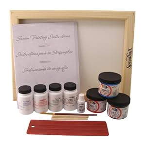 This kit is a terrific simple introduction to fabric screen-printing. This kit is entertaining and simple to use and consists of the essentials for fabric screen printing - DIAZO photo emulsion, drawing fluid and/or screen filler process. Build your own distinctive art for printing on t-shirts and other fabric products. Contains a 10-inch-by-14-inch screen frame, 9-inch plastic squeegee, 3 jars of 4-ounce fabric Ink (Black, Red, Yellow), 4-ounce screen filler, four-ounce drawing fluid, 4-ounce Diazo photo emulsion, four-ounce Diazo photo emulsion remover, .five-gram Diazo sensitizer, 6 round brush and instruction booklet. Fabric inks are AP Non-toxic, odorless, blendable and archival, and clean up with water. Instructions are tri-lingual: English, French and Spanish. Produced in USA.